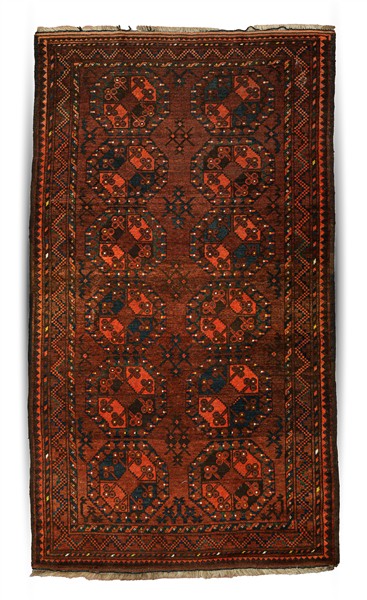 Tappeto Afghan, Turkestan orientale, secolo XX. Decoro con Gul a zampa di elefante con trifoglio di Tamerlano (cm 202x120) (difetti)