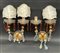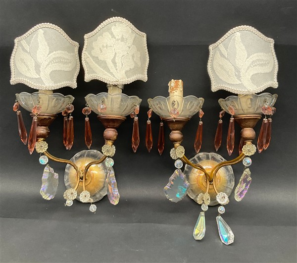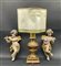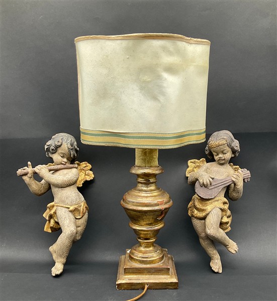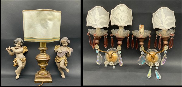 Lotto composto da lampada in legno tornito e dorato, coppia di applique a due fiamme con pendenti in vetro sfaccettato ed una coppia di angioletti musicanti in legno intaglio e parzialmente dorato (difetti e mancanze)