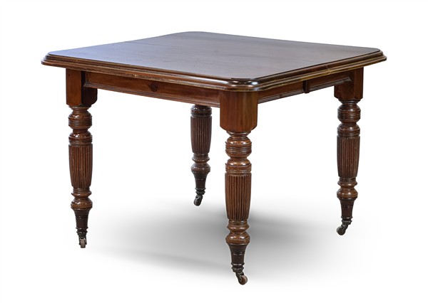 Tavolo allungabile a manovella in mogano con gambe a balaustro tornite e scanalate munito di tre prolunghe originali. Inghilterra, secolo XX (chiuso cm 103x78x103; piano aperto l cm 235) (difetti)