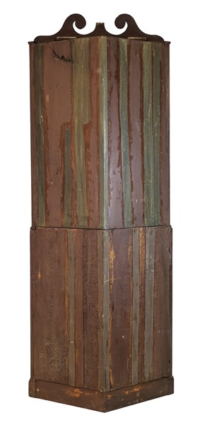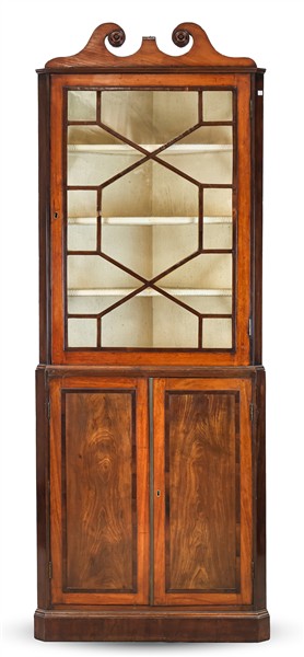 Angoliera in legni vari con parte inferiore a due sportelli pannellati e parte superiore ad uno sportello con vetrina, cimasa mossa (cm 70x200x39) (difetti)