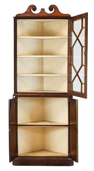 Angoliera in legni vari con parte inferiore a due sportelli pannellati e parte