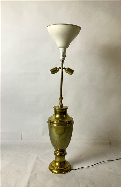 Lampada da tavolo a tre luci in metallo dorato con fusto a balaustro (h con paralume cm 115) (difetti)
