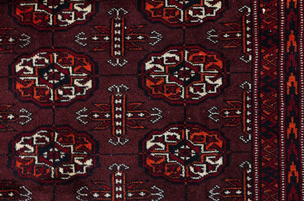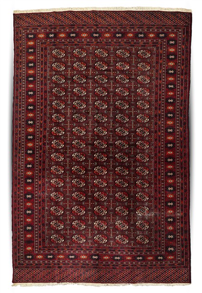 Tappeto Boukhara, Pakistan, secolo XX. Decoro con file di Gul a fondo rosso (cm 277x191) (difetti)