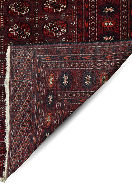 Tappeto Boukhara, Pakistan, secolo XX. Decoro con file di Gul a fondo rosso (cm