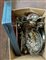 Cartone contenente numerosi oggetti in metallo argentato e altri metalli di div