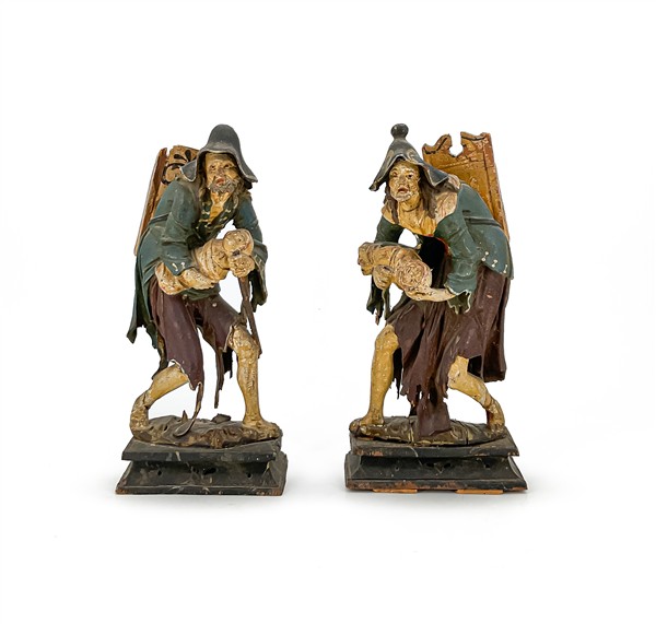 Scultore veneto del secolo XVIII. Due figure popolari di "pitocchi" in legno intagliato e dipinti in policromia (h max cm 26) (difetti e restauri)