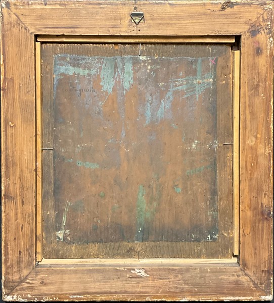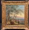 Scuola del secolo XIX, Coppia di "Paesaggi con sosta di viandanti"olio su carta applicata a tavola (cm 28,5x25,5)