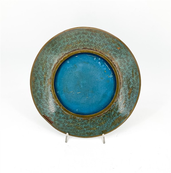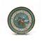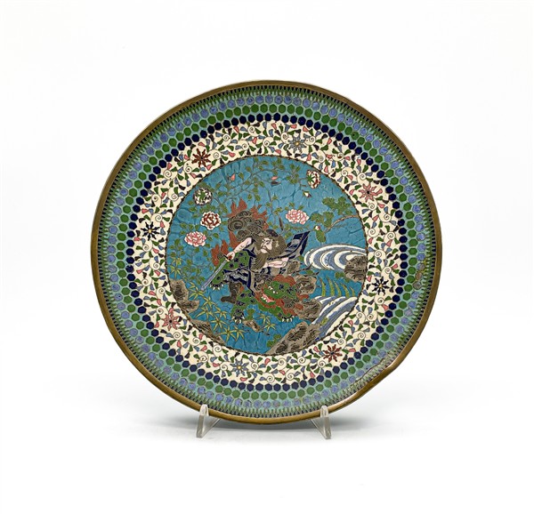 Piatto circolare in smalto cloisonnè con decori stilizzati e figura di combatte