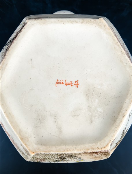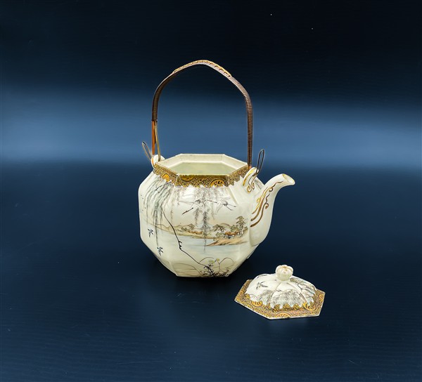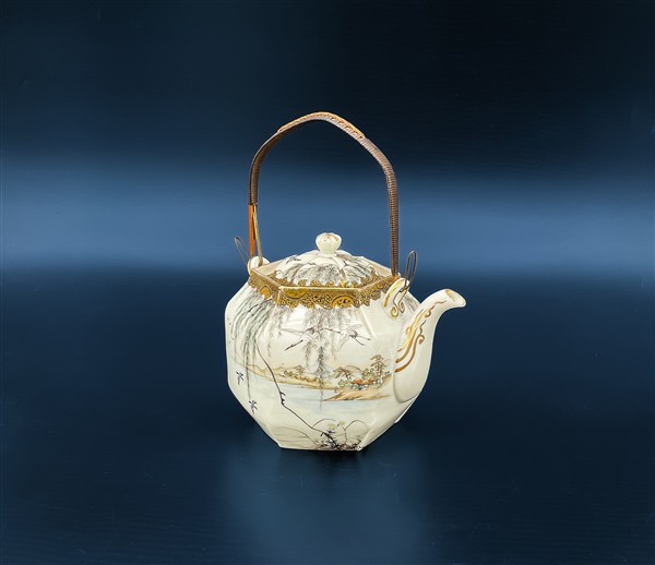 Teiera in porcellana dipinta in policromia e dorature con gru e volatili entro paesaggi. Giappone, periodo Meiji (1868-1912) (cm 15x12) (difetti)
