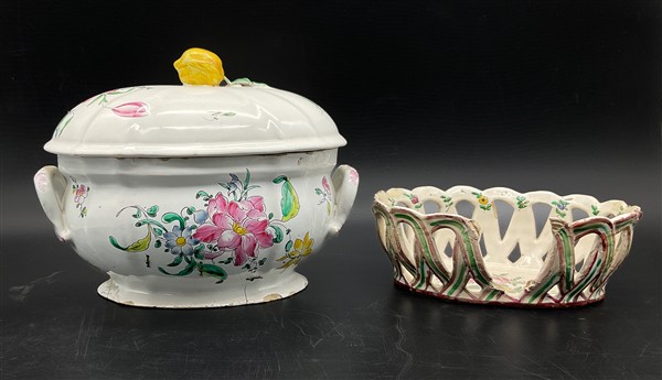 Manifatture differenti, secolo XVIII. Lotto composto da una zuppiera con coperchio dipinta in policromia a fiori, Strasburgo (cm 27x22x20), un cestino in maiolica decorata a motivi floreali, Lodi e due vasetti a calice in maiolica dipinta "al mazzetto", Ginori (h cm 9,5) (difetti, rotture e restauri)