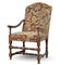 Poltrona in noce con braccioli mossi, gambe e traverse tornite a rocchetto, seduta e schienale rivestiti in tessuto policromo (difetti)