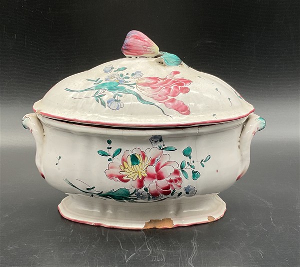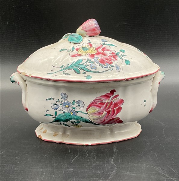 Manifattura Antonio Ferretti, Lodi, secolo XVIII. Zuppiera con coperchio in maiolica dipinta in policromia a fiori, presa del coperchio a frutto a tuttotondo (cm 27x20x19) (difetti)