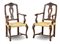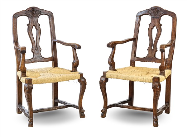 Coppia di poltrone in legno intagliato con schienale a giorno e cartella sagomata, gambe anteriori mosse terminanti a zoccolo e raccordate da traverse, sedute in paglia. Veneto, secolo XVIII-XIX (difetti)
