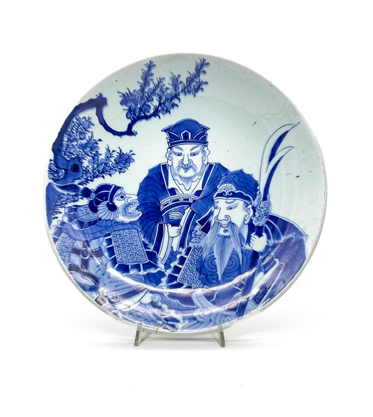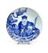Piatto in porcellana decorato nei toni del blu con figure e militari. Giappone,