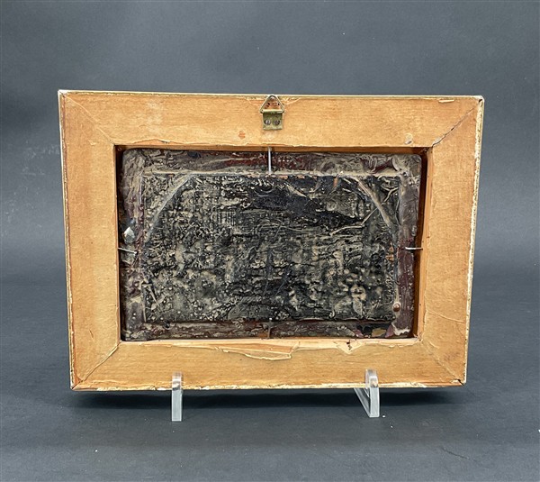 Putinati. Lastra in fusione a rame raffigurante la Scuola di Atene da Raffaello (cm 10x16) in cornice (difetti)