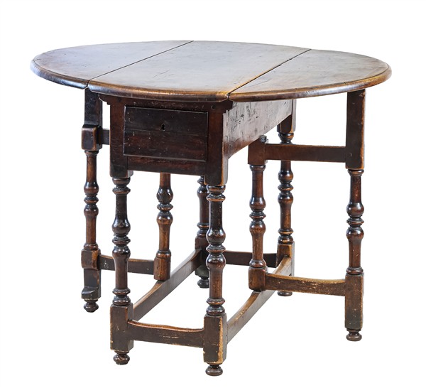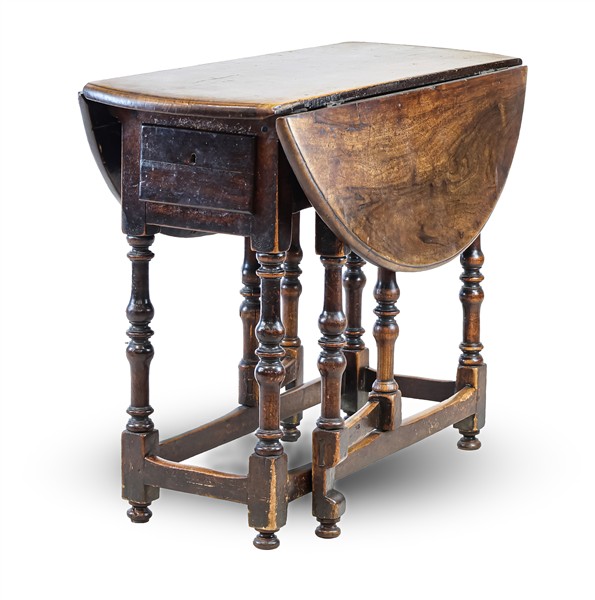 Tavolo tondo a bandelle in legni vari, con cassetto, gambe tornite riunite da traverse. Secolo XVIII (aperto cm 105x79x105) (difetti)