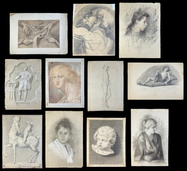 Lotto composto da numerosi studi di volti, figure e mani del secolo XIX-XX, di tecniche e misure differenti