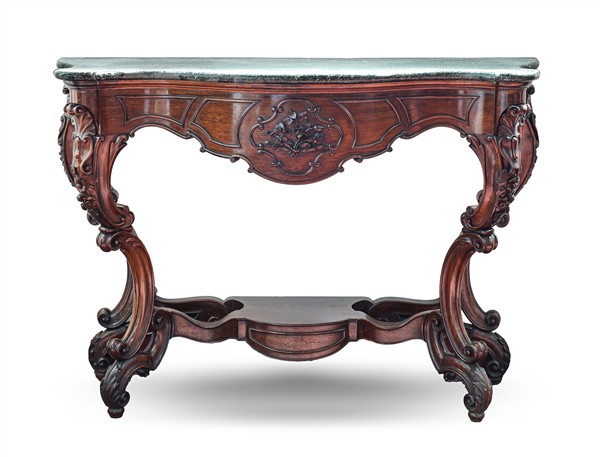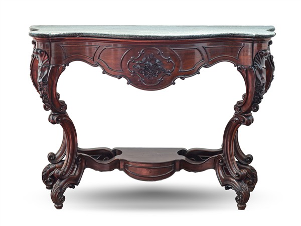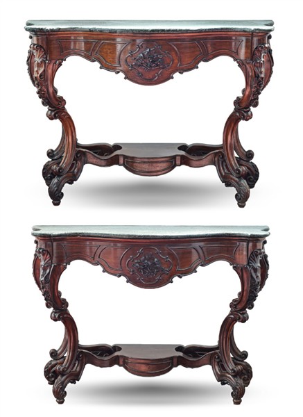 Coppia di console in mogano intagliato con quattro gambe a voluta contrapposta raccordate alla base con pianetto sagomato, decori a rilievo a motivo floreale. Piani in marmo sagomato. Secolo XIX (cm 150x106x56) (lievi difetti)