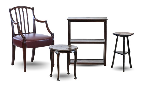 Lotto composto da due tavolini, una poltrona ed una piccola etagere di forme ed epoche differenti (difetti e mancanze)
