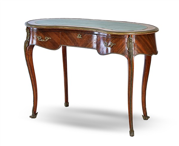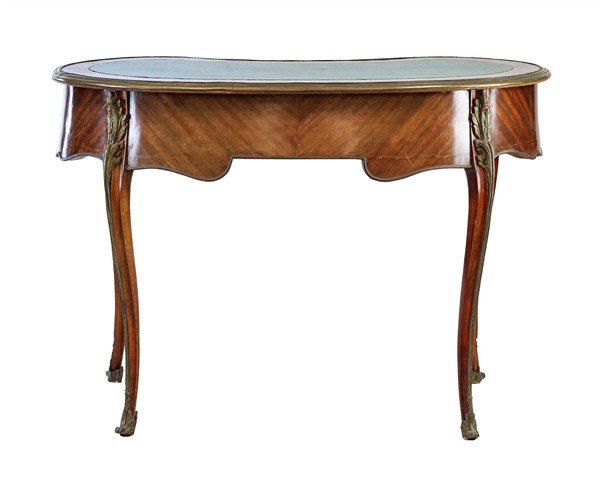 Scrittoio da centro con piano a fagiolo impiallacciato in legni vari, fronte a tre cassetti e gambe mosse, guarnizioni in metallo (cm 114x80x60) (difetti)