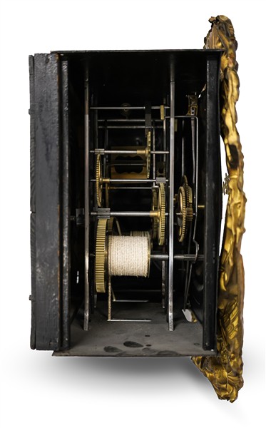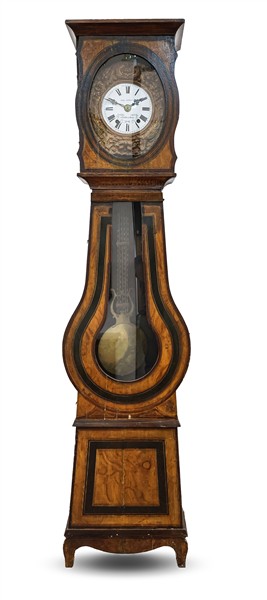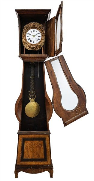 Orologio cassalunga del tipo Morbier in legno, mostra in metallo sbalzato, quadrante in smalto bianco a numeri romani, movimento a due treni con suoneria delle ore e mezze su gong. Francia, seconda metà del secolo XIX (cm 54x230x22) (difetti)