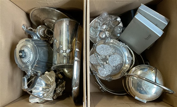 Due cartoni contenenti numerosi oggetti in metallo argentato e altri metalli di