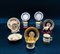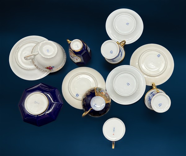 Manifatture diverse. Lotto composto da tazzine con piattini in porcellana dipinta in policroma a decori diversi tra cui una di Meissen con scene portuali entro cartigli a fondo blu e profili dorati (difetti)