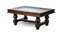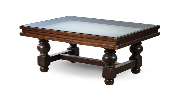 Tavolo vetrina in legno con gambe tornite riunite da traverse e piano in vetro