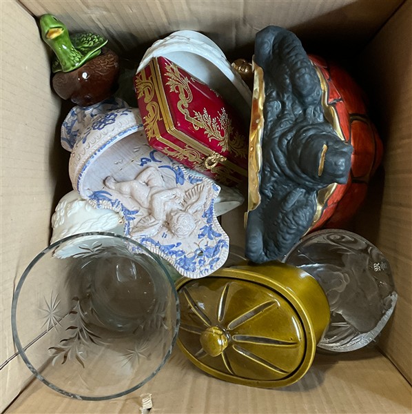 Lotto 1755 | Cartone contenente numerosi oggetti in vetro e ceramica di diversa forma, uso e