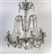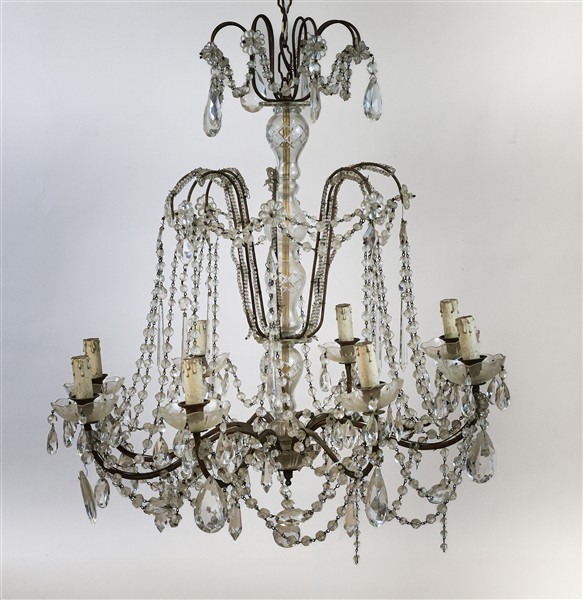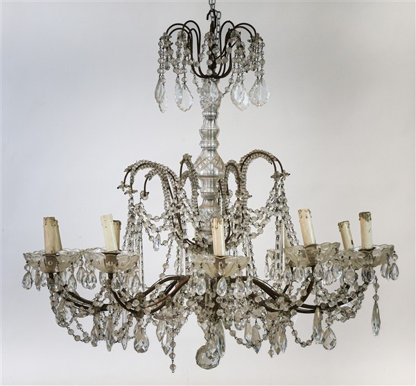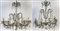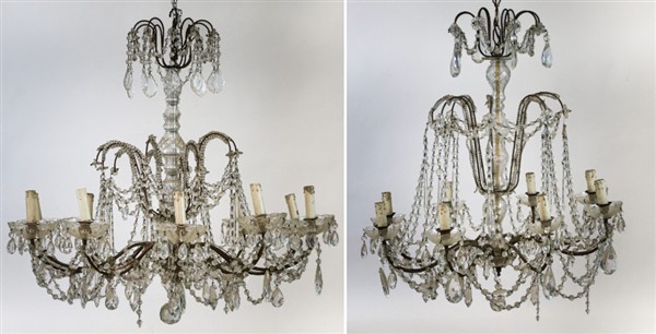 Lotto composto da due lampadari a otto luci con struttura in metallo, bracci mossi, decorati con pendenti e perline in vetro sfaccettato (h max cm 90 ca.) (difetti e piccole mancanze)