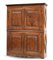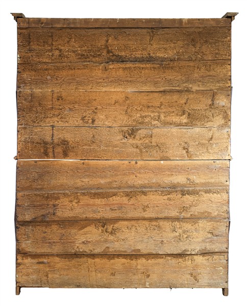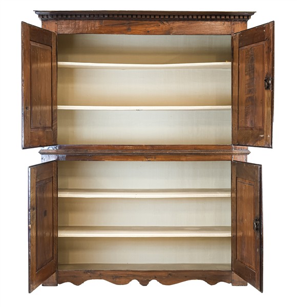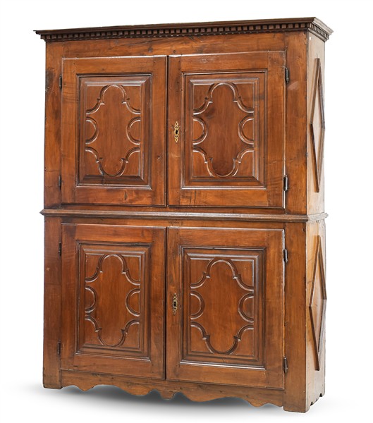 Mobile a due corpi in noce con quattro ante pannellate e scanalate a motivi geometrici, cappello con bordura dentellata. Secolo XVIII. Interno con ripiani (cm 168x207x52) (difetti e restauri)