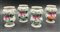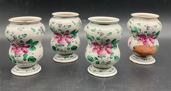 Manifattura Casali e Callegari, Pesaro, secolo XVIII-XIX. Gruppo di quattro albarelli in maiolica dipinta in policromia a motivi floreali (h cm 14) (difetti)