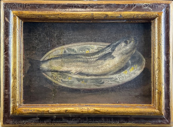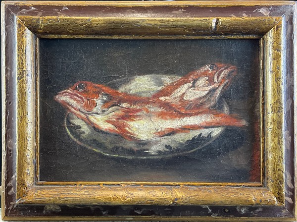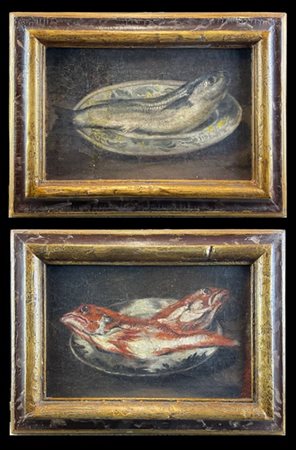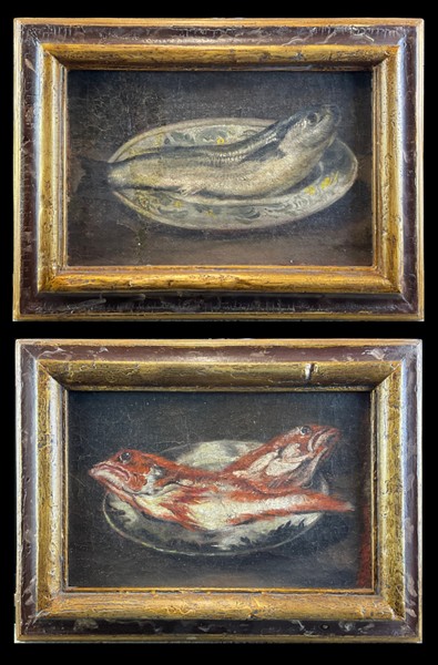 Da modelli del secolo XVIII "Piatti con pesci" coppia di dipinti ad olio su te