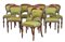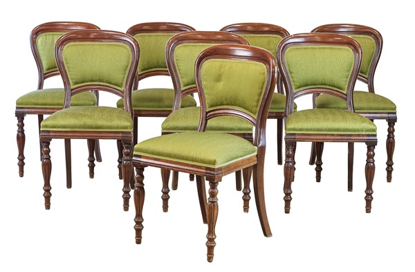 Gruppo di otto sedie in mogano con gambe anteriori tornite e scanalate, posteriori a sciabola, sedute schienale rivestiti in tessuto verde (difetti)