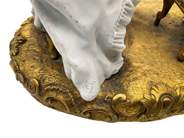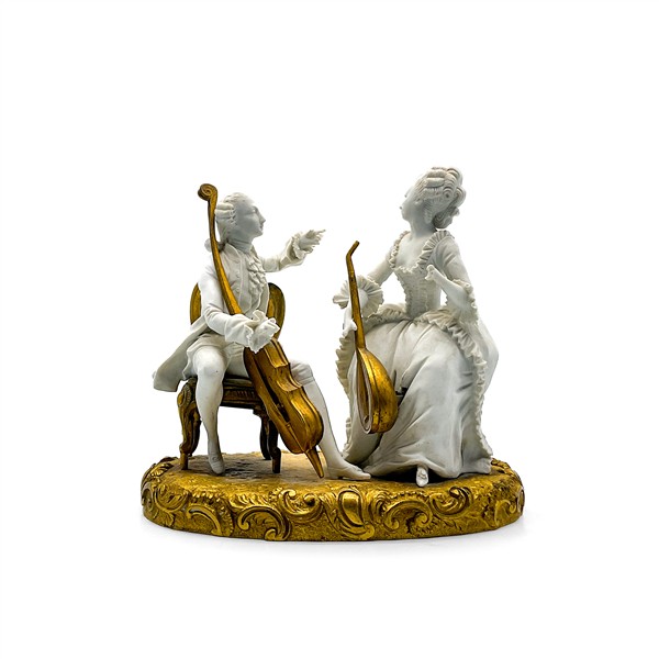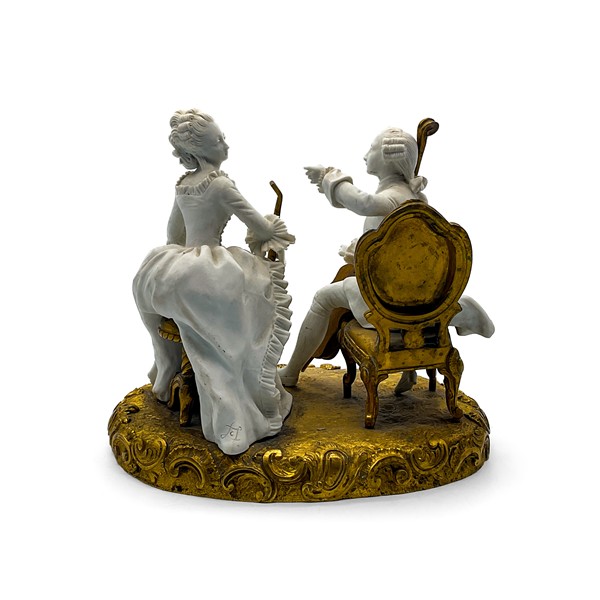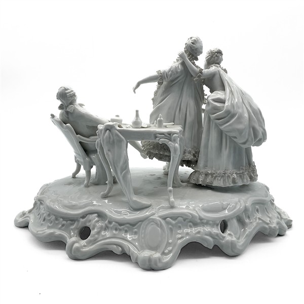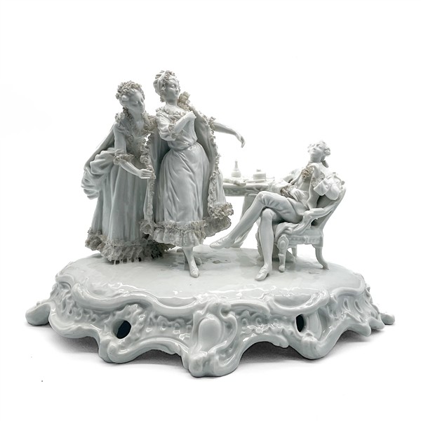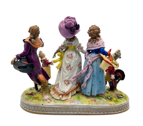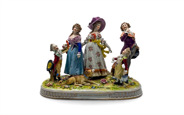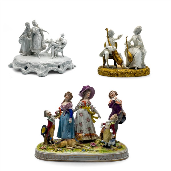 Manifatture differenti, secolo XX. Lotto composto da tre diversi gruppi in porcellana con soggetti e decori diversi tra cui uno raffigurante "La Promenade Publique 1792" e uno con base in metallo dorato (cm max 38x28) (difetti e mancanze)
