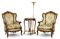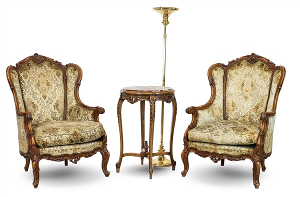Lotto composto da una lampada da terra, un tavolino sagomato con piano in marmo incassato, coppia di poltrone intagliate e un appendiabiti in metallo dorato (difetti)
