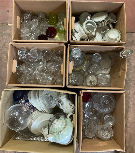 Lotto 1806 | Sei cartoni cartoni contenenti numerosi oggetti in vetro, ceramica e materiali