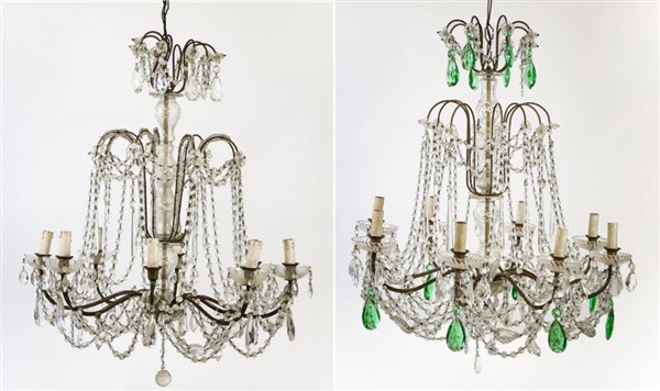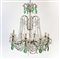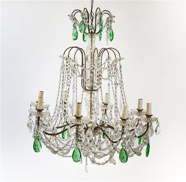Lotto di due lampadari a otto luci con struttura in ferro, decorazioni in pendagli in vetro sfaccettato incolore e verde (h cm 90 ca.) (difetti e piccole mancanze)