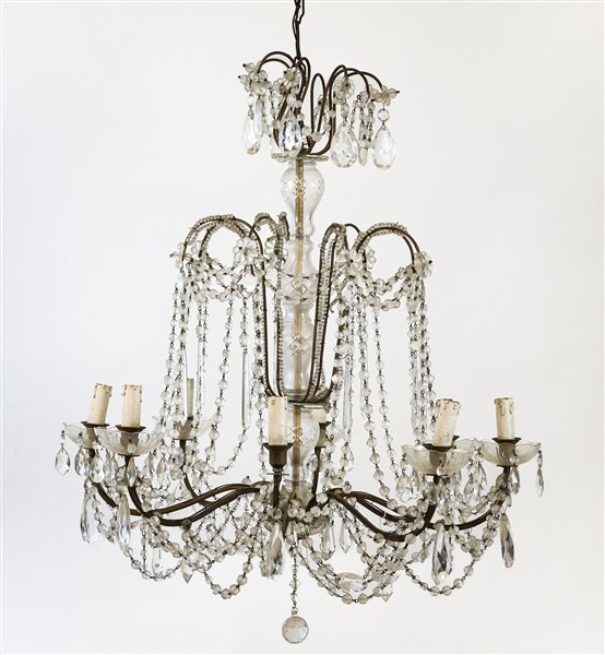 Lotto 1807 | Lotto di due lampadari a otto luci con struttura in ferro, decorazioni in penda