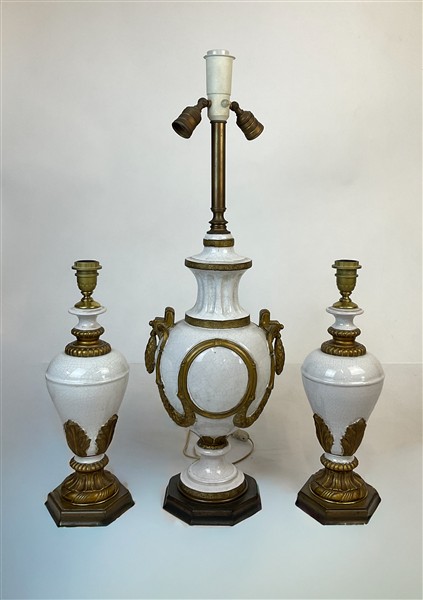Lotto composto da una coppia di basi per lampada e una base per lampada da appoggio con sostegno in ceramica bianca con bordure dorate (h max cm 85) (difetti)