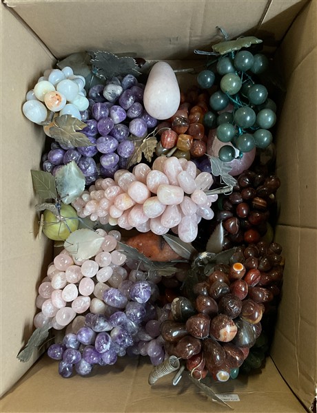 Cartone contenente numerosi oggetti in pietra dura di diversa forma e decoro (difetti)