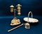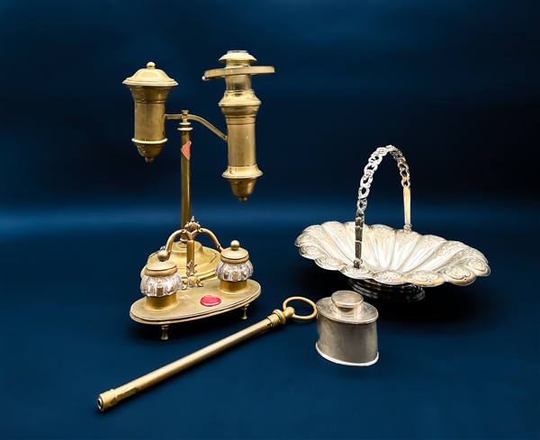 Lotto composto da un portatè, un centrotavola in metallo argentato, un calamaio ed una lampada in ottone (h max cm 40) (difetti)