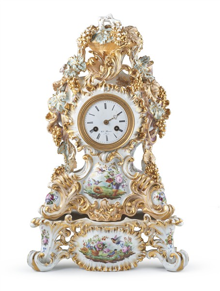 Pendola d'appoggio con cassa di forma mossa in porcellana policroma della manifattura francese di Jacob Petit decorata a foglie di vite e uva tra rocaille, su base rettangolare con piedi a ricciolo. Quadrante in smalto bianco a numeri romani, movimento a due treni con suonoeria delle ore e mezza. Secolo XIX (h. cm 42) (difetti e mancanze)