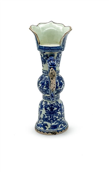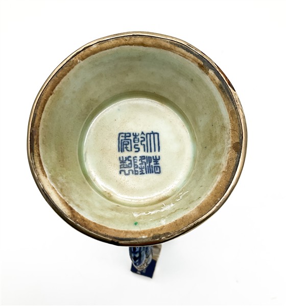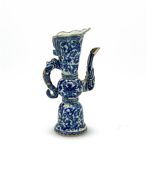 Versatoio in porcellana bianca e blu con decoro floreale, ansa e beccuccio a draghi a rilievo, inserti in metallo argentato. Reca marchio apocrifo Qianlong sotto la base.