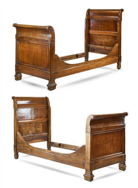 Coppia di letti a barca in noce con pediera e testiera sagomate. Secolo XIX (cm cad. 89x124x215) (difetti)