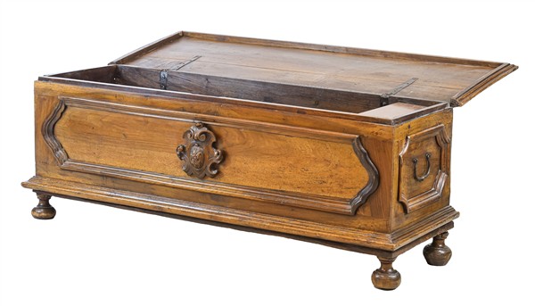 Lotto 1839 | Cassapanca in noce con fronte e fianchi decorati da cornicette sagomate e stemm