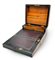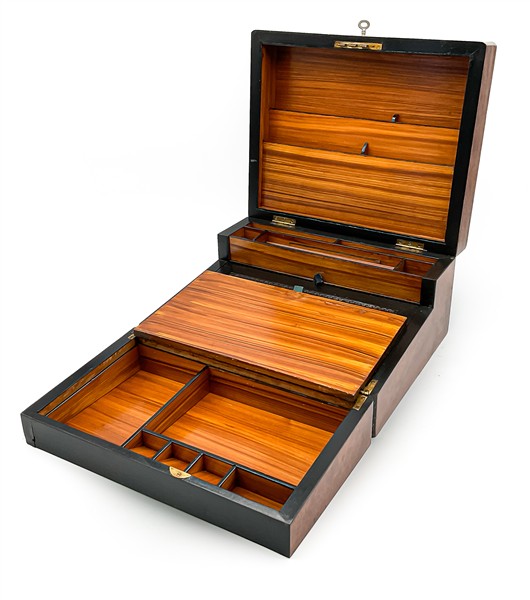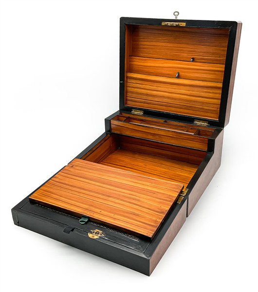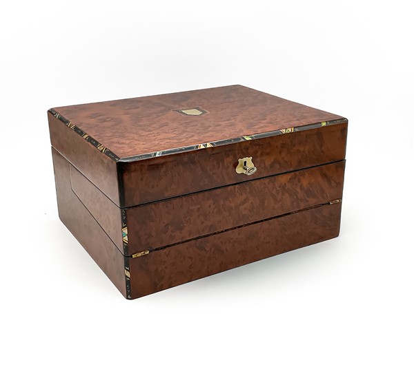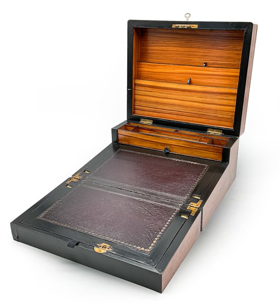 Scrittoio da viaggio lastronato in radica con inserti in madreperla e ottone, i