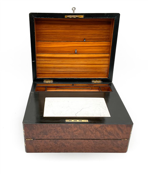 Scrittoio da viaggio lastronato in radica con inserti in madreperla e ottone, interno con vani e pianetto apribile, internamente rivestito in pelle impressa, parte superiore a finto marmo. Inghilterra, inizio secolo XX (cm 27x17x33) (difetti)