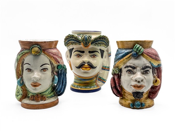 Lotto 1849 | Manifattura di Caltagirone, secolo XX. Tre cachepot a testa di moro in ceramica