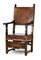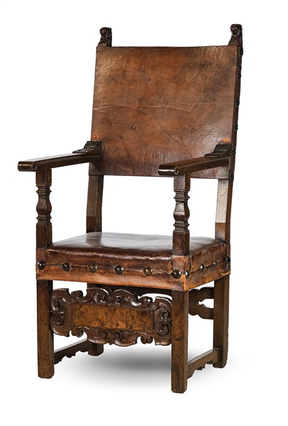 Seggiolone in noce con gambe squadrate riunite da traverse e cartella intagliata a volute sul fronte, braccioli con attaccature intagliate a grifone alato e coronato, cimature a testa leonina, secolo XVII (difetti e restauri).